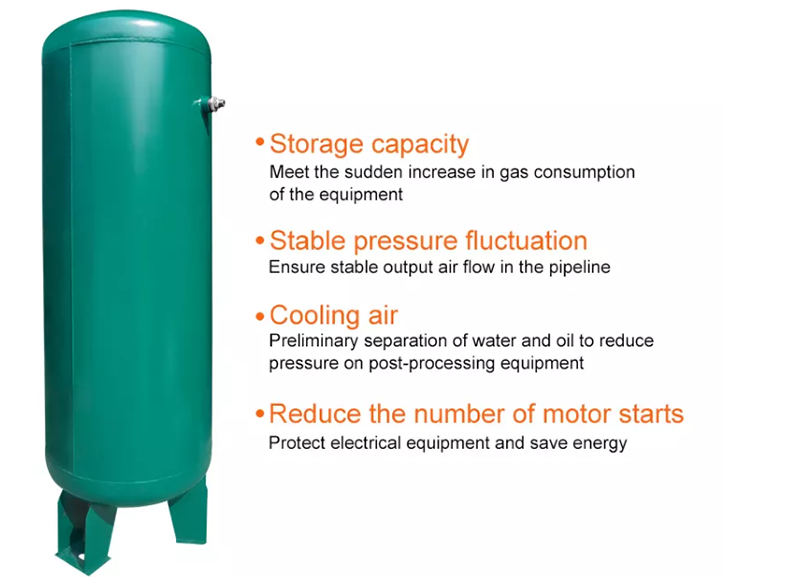يمكن لخزان تخزين الهواء أن يوفر عناء فتح نظام الضاغط ببضع ثوانٍ فقط من الهواء.هذا يقلل من تكلفة استخدام الضاغط.كما تم تخفيض تكاليف الاستخدام والصيانة الكهربائية.ثم ، مع زيادة كمية الاستخدام ، يمكن تخزين الهواء.